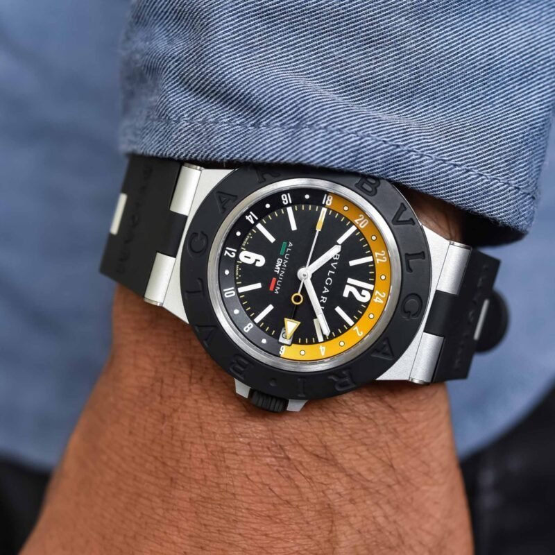 👉🏽 Features: Powered by original Japanese GMT Automatic machinery, Stainless Steel round case with a Black matte finished bezel, Sapphire crystal glass on Black Dial With Black & Yellow Bezzel, Working GMT Hour Date Counter and luminous hands, fastened by high grade Black patented Silicone strap with a Bvlgari pin buckle.