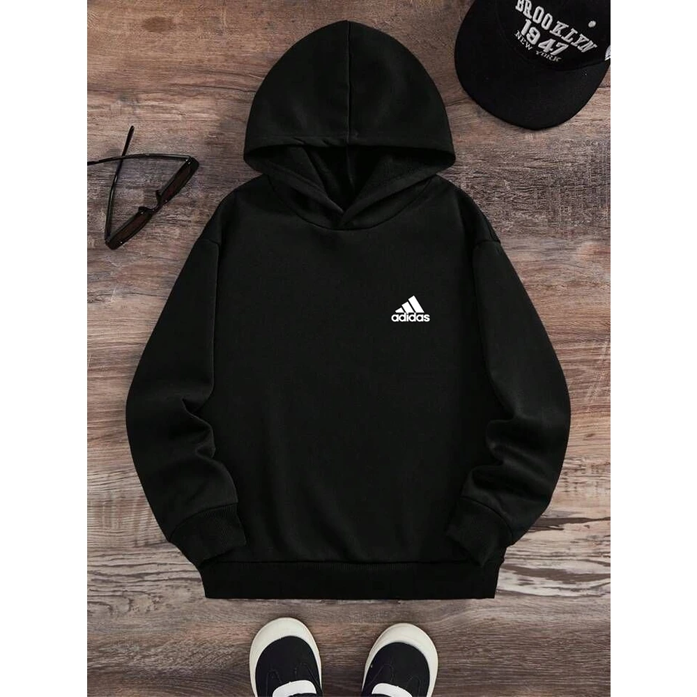 Premium Cotton Printed Adidas Hoodie For Men, Black