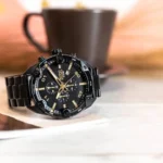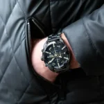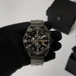ππΌ Features: Powered by original Japanese quartz machinery, Stainless-steel round black case with black bezel, mineral crystal glass on black dail with stopwatch- chronograph with date indicator, fastened by stainless-steel black chain with a deployment clasp.