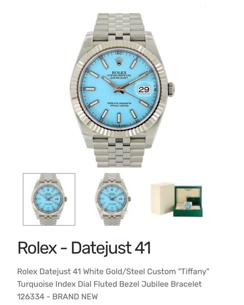 Rolex Datejust 41 White Gold/Steel Custo “Tiffany” Turquoise Index Dial Fluted Bezel Jubilee Bracelet 126334 – BRAND NEW Item No. 126334TIBSJ_*