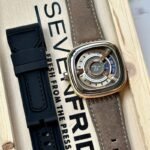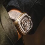 ❣️_..The Sevenfriday M2/04 RUNWAY in a 47.6 mm (W) x 47 mm (H) stainless steel golden case with Steel Bezzel. Electric Silver insert surrounds the dial which has a base of horizontally striped Steel contrasted with a SEVENFRIDAY logo…_