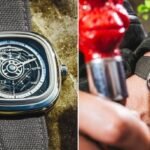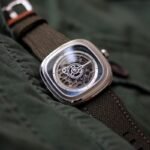 *The Sevenfriday T2/01 Encased in a 47.6 mm (W) x 47 mm (H) stainless steel case with a Green animation ring. Electric insert Green surrounds the dial which has a base of horizontally striped gun metal contrasted with a SEVENFRIDAY logo picked out in Green colour*