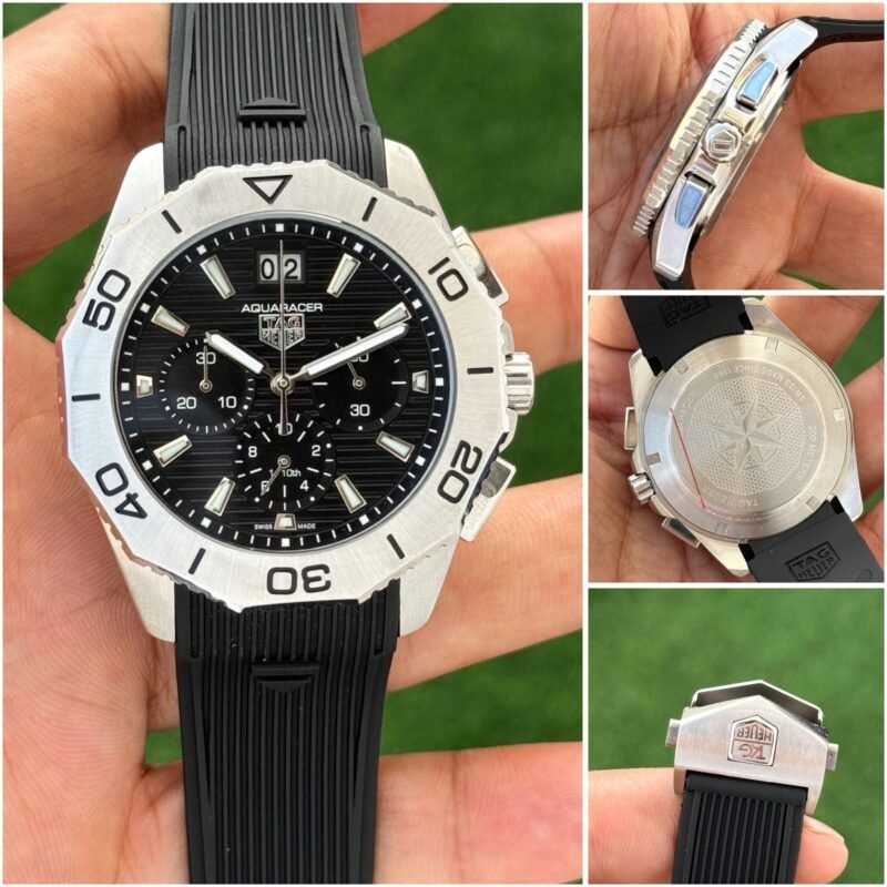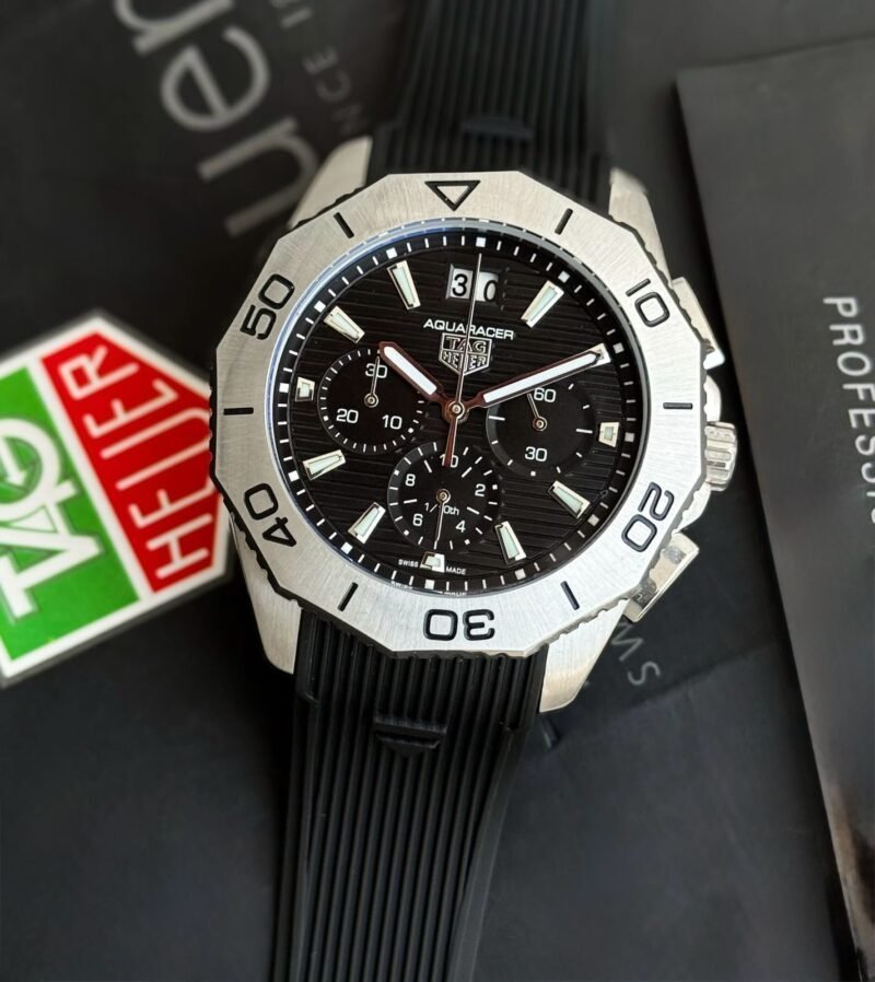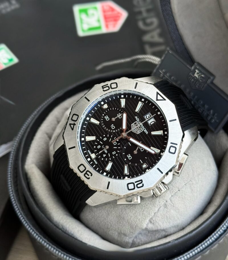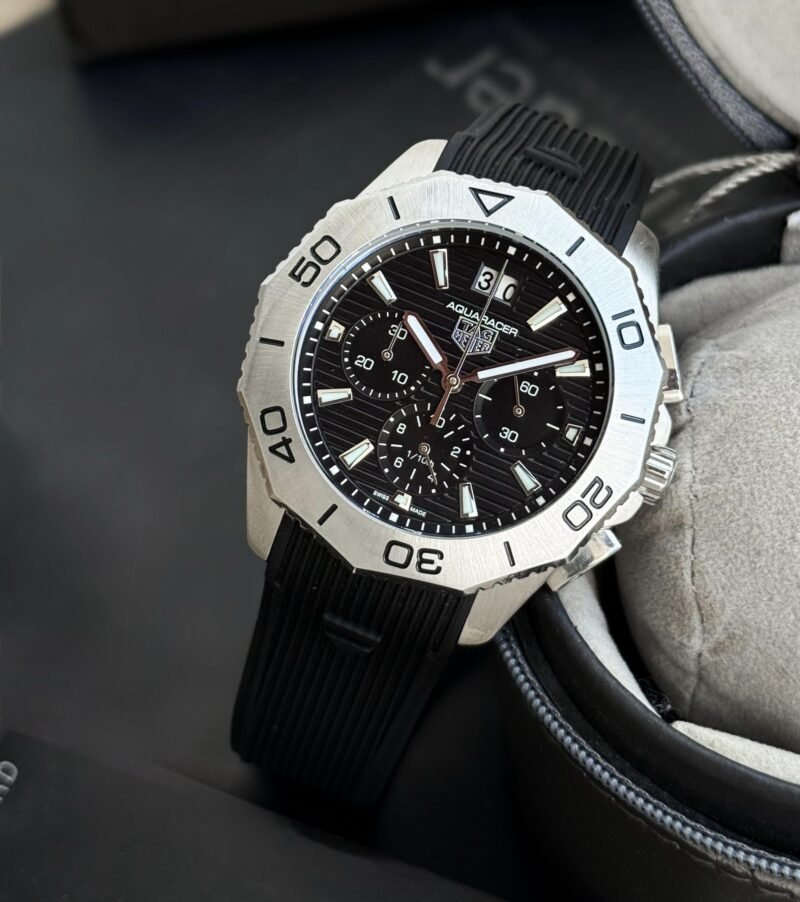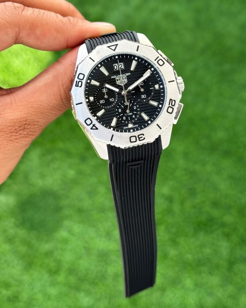 *Its bold black dial and striking design makes the TagHeuer Aquaracer a statement of sophistication.*