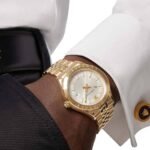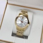 👉🏽 Features: Powered by original Japanese quartz machinery, Stainless-steel gold round case with a gold bezel, Anti-reflective sapphire glass on a silver dial with gold indices and hands, fastened by a stainless-steel gold chain with a butterfly clasp.