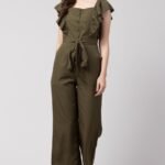 Elevate your style with this chic olive jumpsuit. Made from durable polyester, it features a stylish box neck and flowing cape sleeves, perfect for any casual or semi-formal occasion.